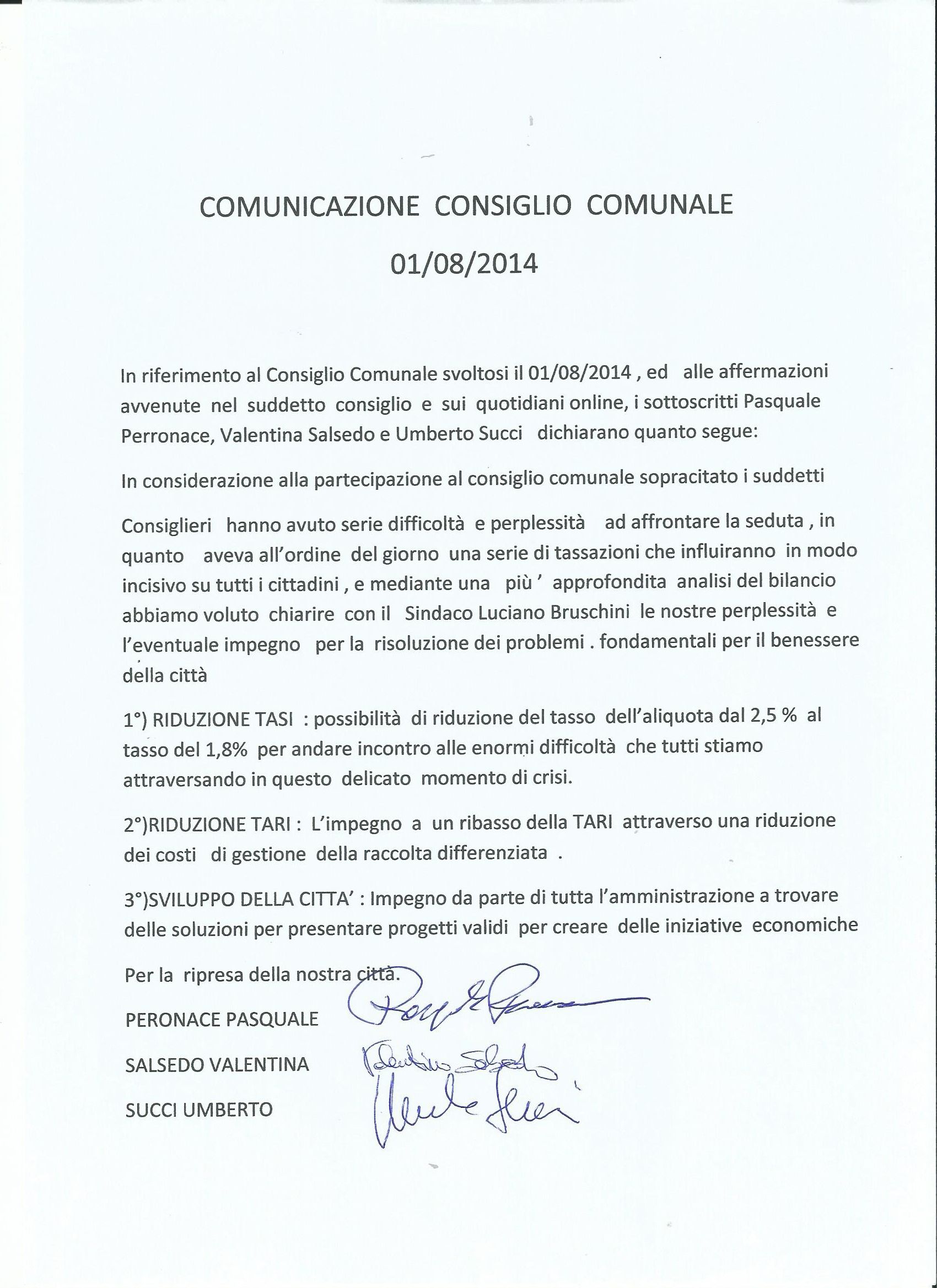 Pubblico la nota ricevuta dai consiglieri “dissidenti”. Ognuno può farsi una sua idea. L’auspicio è che i punti 1, 2 e 3 siano stati veramente il motivo del contendere e che presto avremo le riduzioni richieste e i progetti per lo sviluppo della città. (gdg)