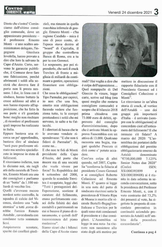A dire il vero, c’è molto, molto altro da sapere. Al posto dei sei consiglieri – e non solo – al sindaco andrebbe chiesto “a chi ci hai messo in mano?” dopo che Agostino Gaeta ha tracciato il profilo del presidente Ernesto Monti in tre pagine (vedi sotto) piene dei flop del professore, molto simili a quelli della Capo d’Anzio.