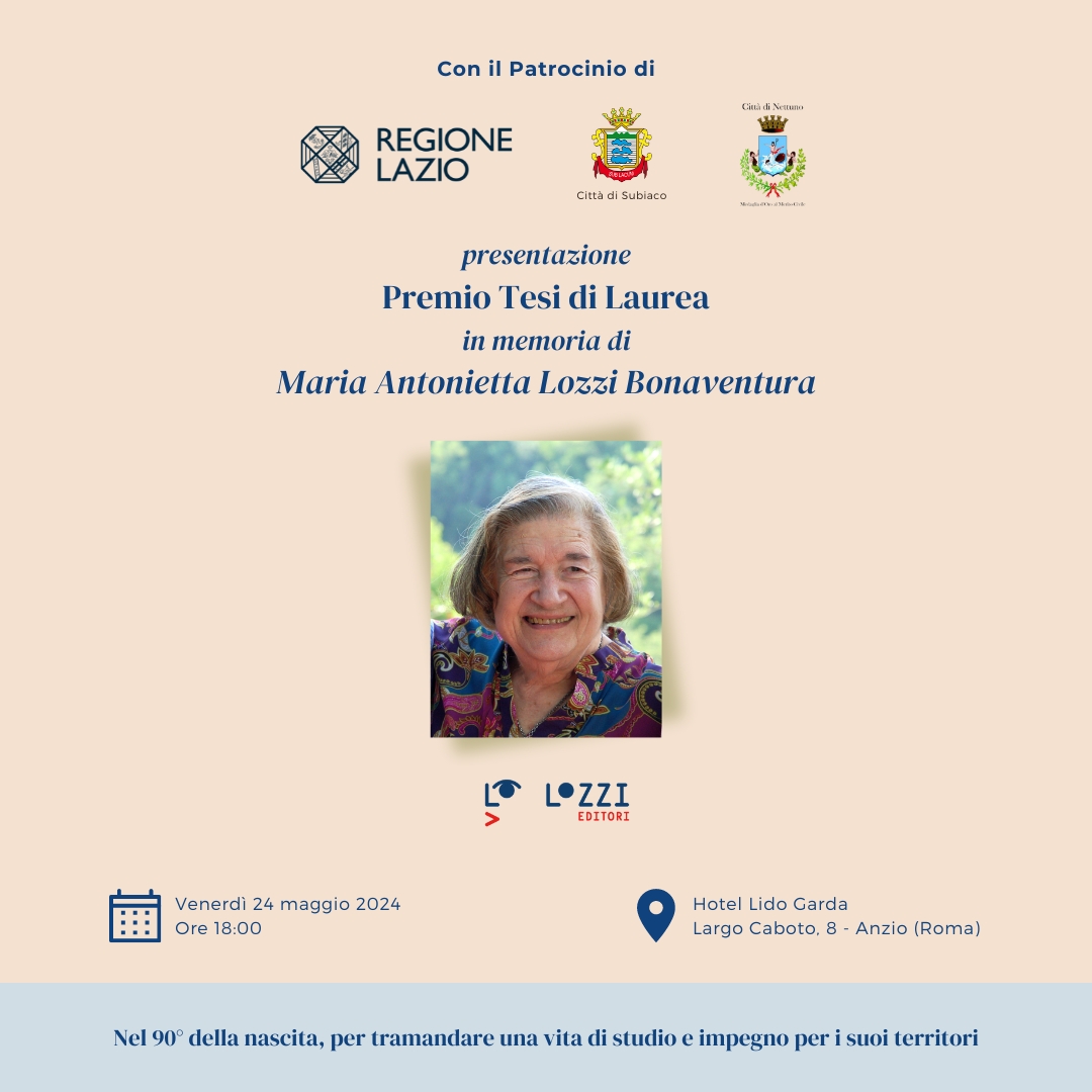 Chi scriverà una tesi di laurea relativa ai luoghi cari ad Antonietta – la Subiaco delle origini, Anzio e Nettuno dove ha vissuto, lavorato ed è stata impegnata in prima fila in numerose iniziative e battaglie – concorrerà a un premio che la casa editrice della famiglia Lozzi metterà a disposizione e che consisterà anche nella pubblicazione del lavoro. Si aggiungeranno, ne sono certo, altri a sostenere la realizzazione del premio.